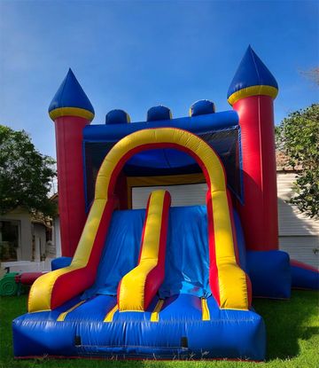 This commercial grade bounce houses features a double lane inflatable slide mounted to the side of the bouncer. The bounce house itself gets an arched roofline for extra headroom, and the inflatable turrets at each corner add a touch of fantasy to the unit. Mesh coverings on the bounce house windows and over the top of the double slide are finger-friendly and give additional safety to participants. Here, shades of blue are accented by bright red vinyl.