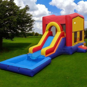 This module combo is available to suit outdoor festivals and parties of all kinds. It features a bounce house with a peaked roof for additional interior headroom and an attached single-lane water slide. 🛝 The huge rectangular splash pool 🌊 at its base offers a wet and wild thrill for young participants. Each side of the bouncer has mesh-covered window openings for ventilation. A side mounted entrance ramp and flapped opening allow children to climb inside easily.